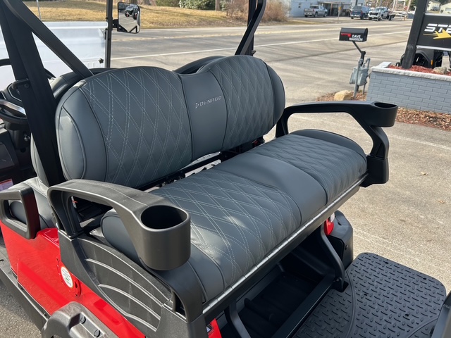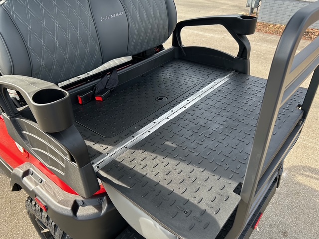 The interior of Denago golf cars offers a blend of luxury and convenience. The dash is equipped with four cup holders and a dedicated cell phone holder, making it easy to stay hydrated and connected while on the go. The luxury seats come with armrests for added comfort, and the adjustable steering wheel ensures a personalized driving experience. The premium floor mats add durability, while the three-point seatbelts ensure passenger safety