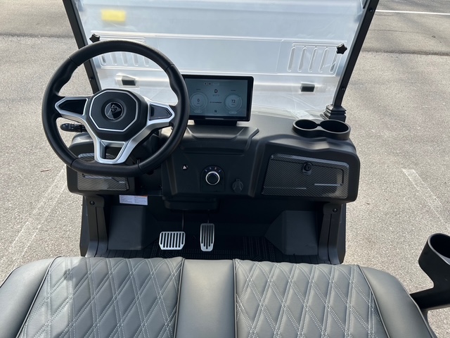 The design of these models showcases futuristic feel, with a front end reminiscent of the Tesla Cybertruck. Stylish wheels and an aggressive brush guard complement the look. Available in a variety of cool colors like Lava, Blue, White, Black, and more, you can easily find a cart that fits your vibe. Other notable exterior features include standard LED lights, side mirrors, a storage compartment, a windshield, and a canopy with grab handles.