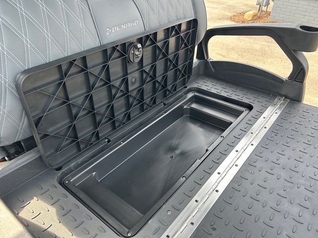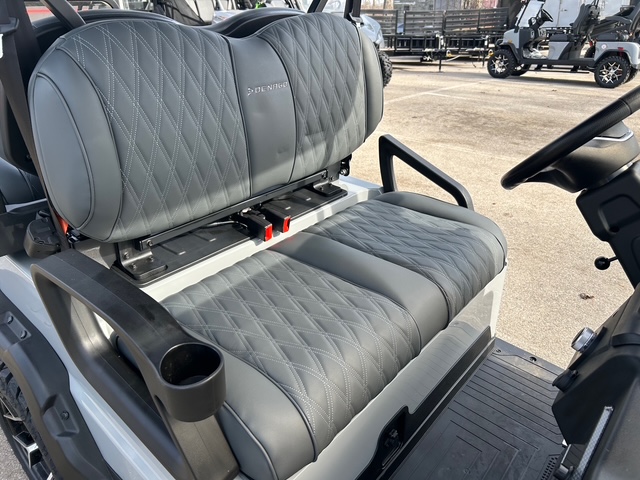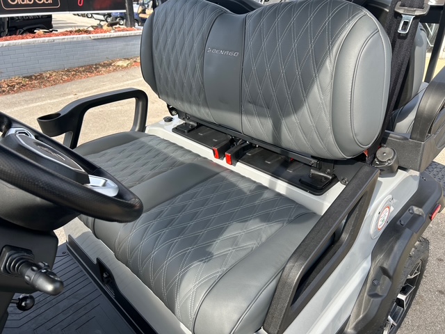 The interior of Denago golf cars offers a blend of luxury and convenience. The dash is equipped with four cup holders and a dedicated cell phone holder, making it easy to stay hydrated and connected while on the go. The luxury seats come with armrests for added comfort, and the adjustable steering wheel ensures a personalized driving experience. The premium floor mats add durability, while the three-point seatbelts ensure passenger safety