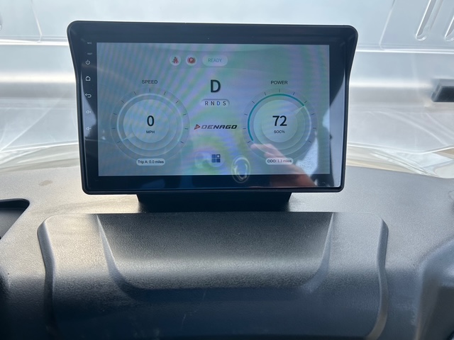 Denago golf carts feature a digital dash display providing key information like speed, battery level, and mileage, along with a backup camera. They also feature Apple CarPlay® and Android Auto® for seamless connectivity.