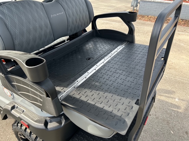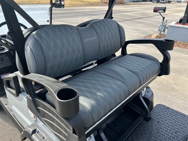 The interior of Denago golf cars offers a blend of luxury and convenience. The dash is equipped with four cup holders and a dedicated cell phone holder, making it easy to stay hydrated and connected while on the go. The luxury seats come with armrests for added comfort, and the adjustable steering wheel ensures a personalized driving experience. The premium floor mats add durability, while the three-point seatbelts ensure passenger safety