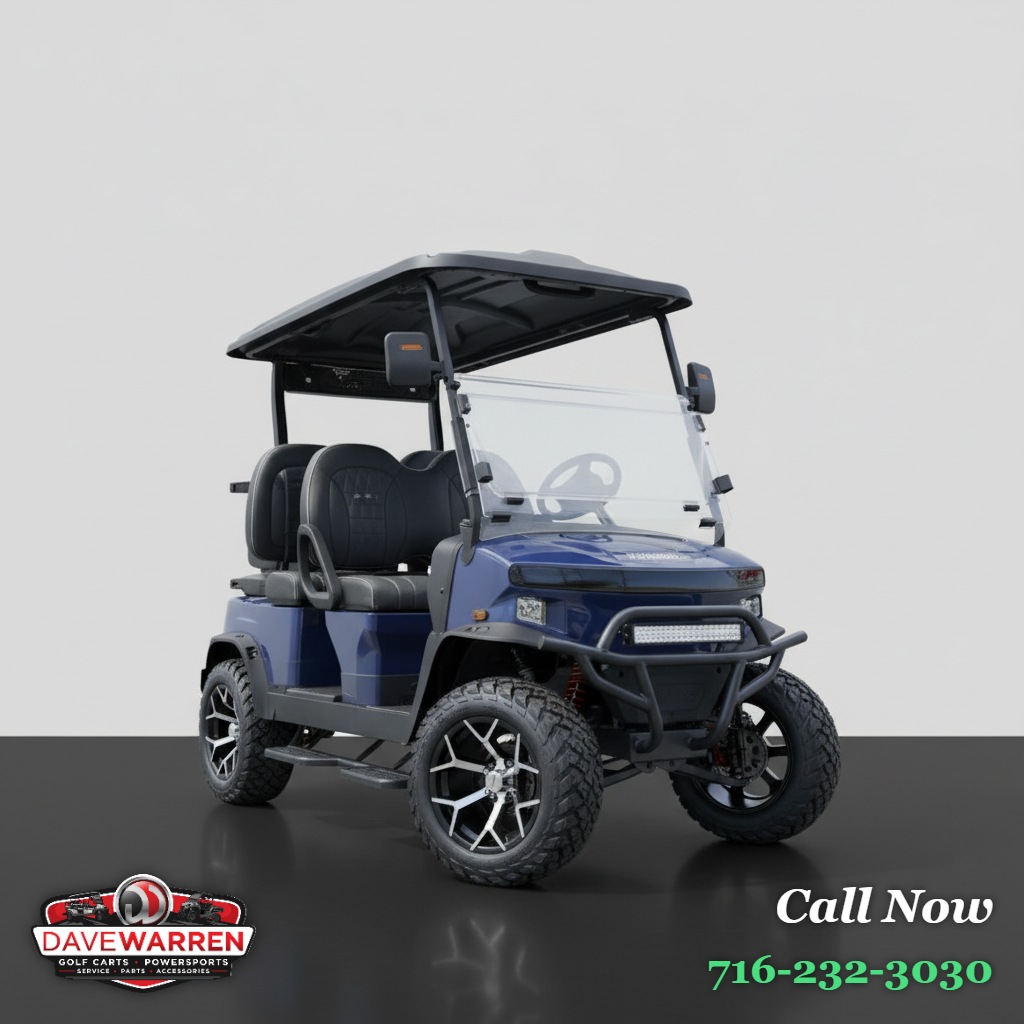 The design of these models showcases futuristic feel, with a front end reminiscent of the Tesla Cybertruck. Stylish wheels and an aggressive brush guard complement the look. Available in a variety of cool colors like Lava, Blue, White, Black, and more, you can easily find a cart that fits your vibe. Other notable exterior features include standard LED lights, side mirrors, a storage compartment, a windshield, and a canopy with grab handles.