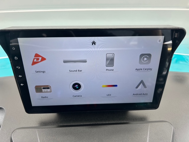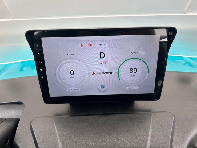 Denago golf carts feature a digital dash display providing key information like speed, battery level, and mileage, along with a backup camera. They also feature Apple CarPlay® and Android Auto® for seamless connectivity.