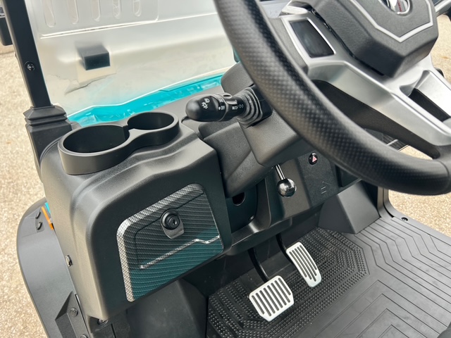 The interior of Denago golf cars offers a blend of luxury and convenience. The dash is equipped with four cup holders and a dedicated cell phone holder, making it easy to stay hydrated and connected while on the go. The luxury seats come with armrests for added comfort, and the adjustable steering wheel ensures a personalized driving experience. The premium floor mats add durability, while the three-point seatbelts ensure passenger safety